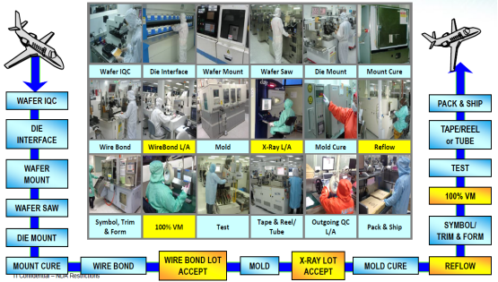 器件一般的生產工藝流程如下圖所示,黃色高亮部分表示為汽車級器件比工業級器件更多的篩選流程。