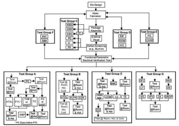 (1)群組 A- 加速環境應力測試(ACCELERATED ENVIRONMENT STRESS TESTS) 共 6 項測試,包含:PC、THB、HAST、AC、UHST、TH、TC、PTC、HTSL。