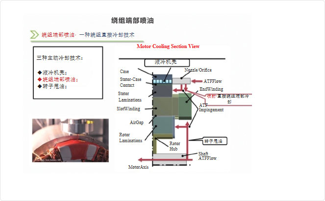 噴油冷卻是目前前沿的冷卻方式,具有散熱效率高,可直接接觸電機內部發(fā)熱部件的特點,但是復雜的油路系統(tǒng)設計及工藝限制了其發(fā)展。由于其突出的優(yōu)勢,很多廠家及研究機構都投入到對噴油冷卻方式的研究,爭相占據技術領先位置。 奧思偉爾對端部噴油技術做了相關的研究并應用于生產,通過調整不同位置噴油嘴之間的流量分配,相應的流速分配使得冷卻效率最高,優(yōu)化噴油嘴外形設計,優(yōu)化滲流路徑,優(yōu)化噴射后流體滲透流經的繞組端部、鐵芯的路徑和方式,提高散 熱效率,以提高電機功率密度。